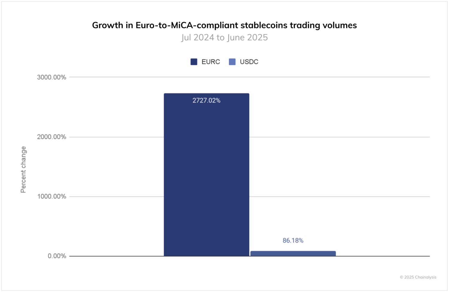 April 2025: EURC volumes spiked while USD stablecoin demand declined, marking a strategic shift from USD to EUR-denominated stablecoins, influenced by both regulatory changes and geopolitical developments including U.S. tariff policy changes.
