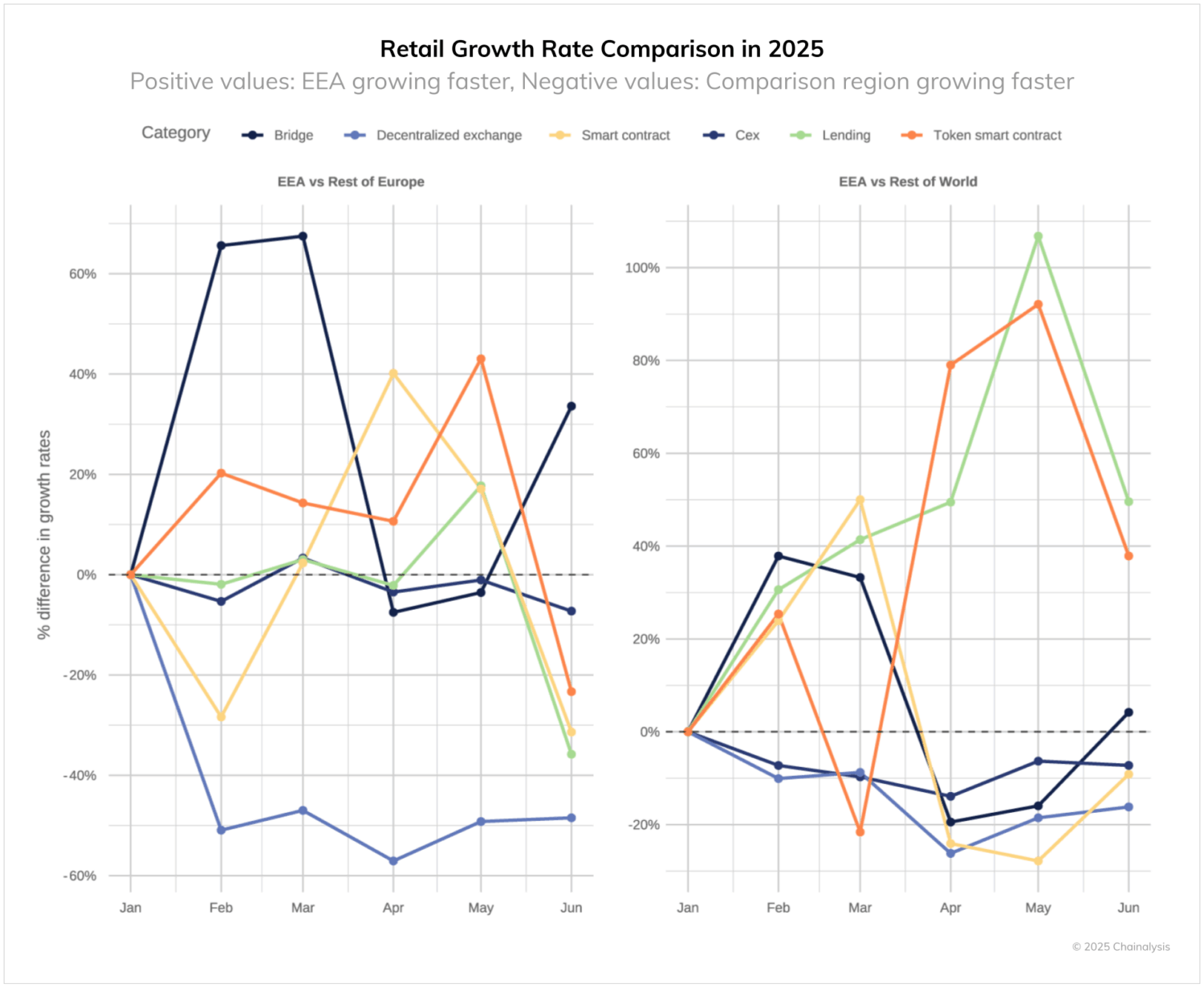 The EEA shows distinctive performance in two categories: “token smart contracts” and “lending.” Token contract activity, including minting and burning of digital assets, increased during the regulatory transition period. Lending activity reached its peak in May 2025, reflecting users’ engagement with various DeFi services for lending and borrowing against crypto assets.