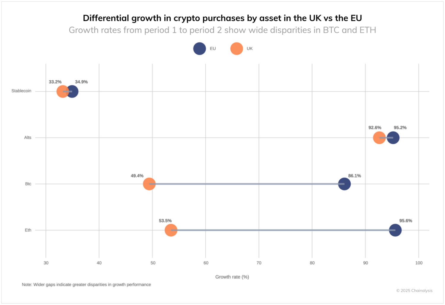 While the United Kingdom has ceded its regional top spot to Russia, it maintains a robust and diverse crypto market, demonstrating 32% growth over the last year. However, the data reveal shifting patterns in trading activity compared to its European neighbors. Asset-level analysis of UK purchasing on centralized exchanges shows stablecoin and altcoin activity matching EU-denominated volumes, while BTC and ETH purchases have been notably more subdued.