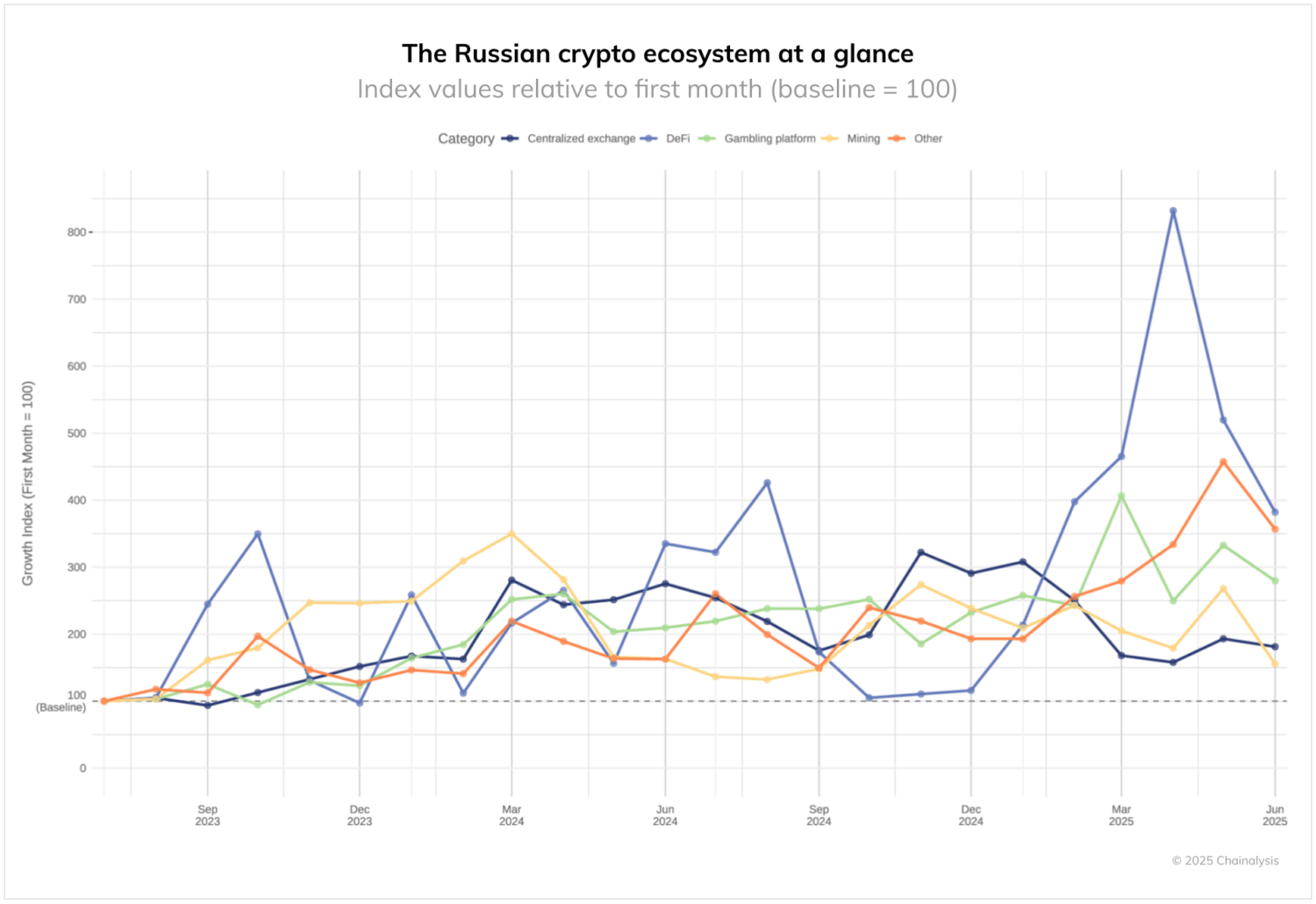 DeFi adoption patterns reveal an even more dramatic shift. Early 2025 saw DeFi activity surge to eight times its previous levels, eventually stabilizing at roughly three and a half times the mid-2023 baseline. This rapid DeFi expansion, coupled with the increase in large-value transfers, indicates growing adoption of crypto for financial services. The A7A5 ruble stablecoin exemplifies this trend, facilitating cross-border payments for both institutional and business users.