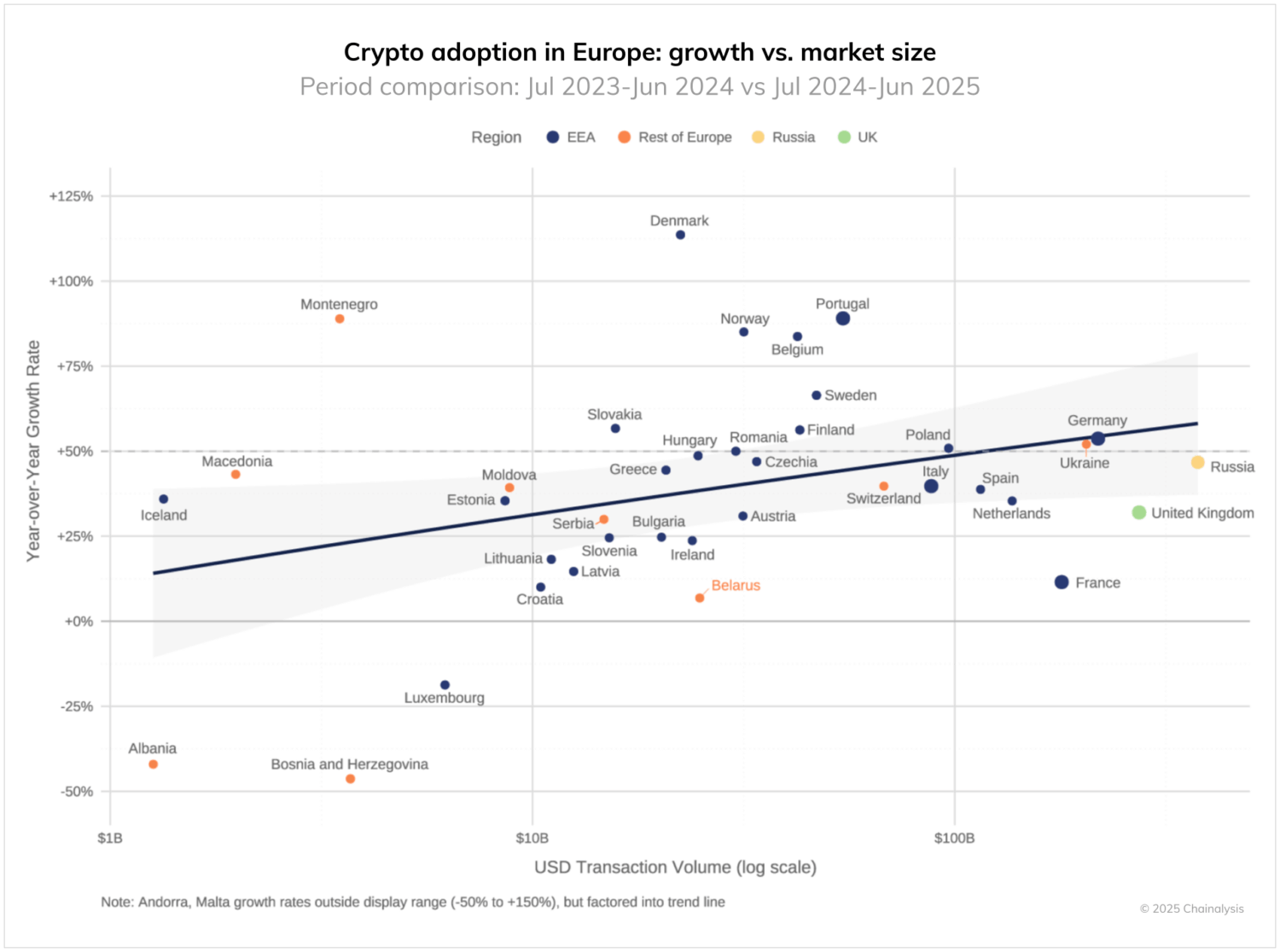 Note on our methodology: In previous reports, we have treated Central, Northern & Western Europe and Eastern Europe as separate regions. For this year’s analysis, we’ve reorganized our regional classifications to better reflect both current crypto activity and geopolitical realities. The data are now categorized into three main groups: The European Economic Area (EEA), which includes Austria, Belgium, Bulgaria, Croatia, Cyprus, Czechia, Denmark, Estonia, Finland, France, Germany, Greece, Hungary, Ireland, Italy, Latvia, Lithuania, Luxembourg, Malta, Netherlands, Poland, Portugal, Romania, Slovakia, Slovenia, Spain, Sweden, Iceland, Liechtenstein, Norway; Rest of Europe; and Russia and the UK (analyzed separately due to their significantly larger crypto activity volumes). This new structure provides a more accurate representation of crypto market activity while accounting for the region’s distinct regulatory and geopolitical landscapes.