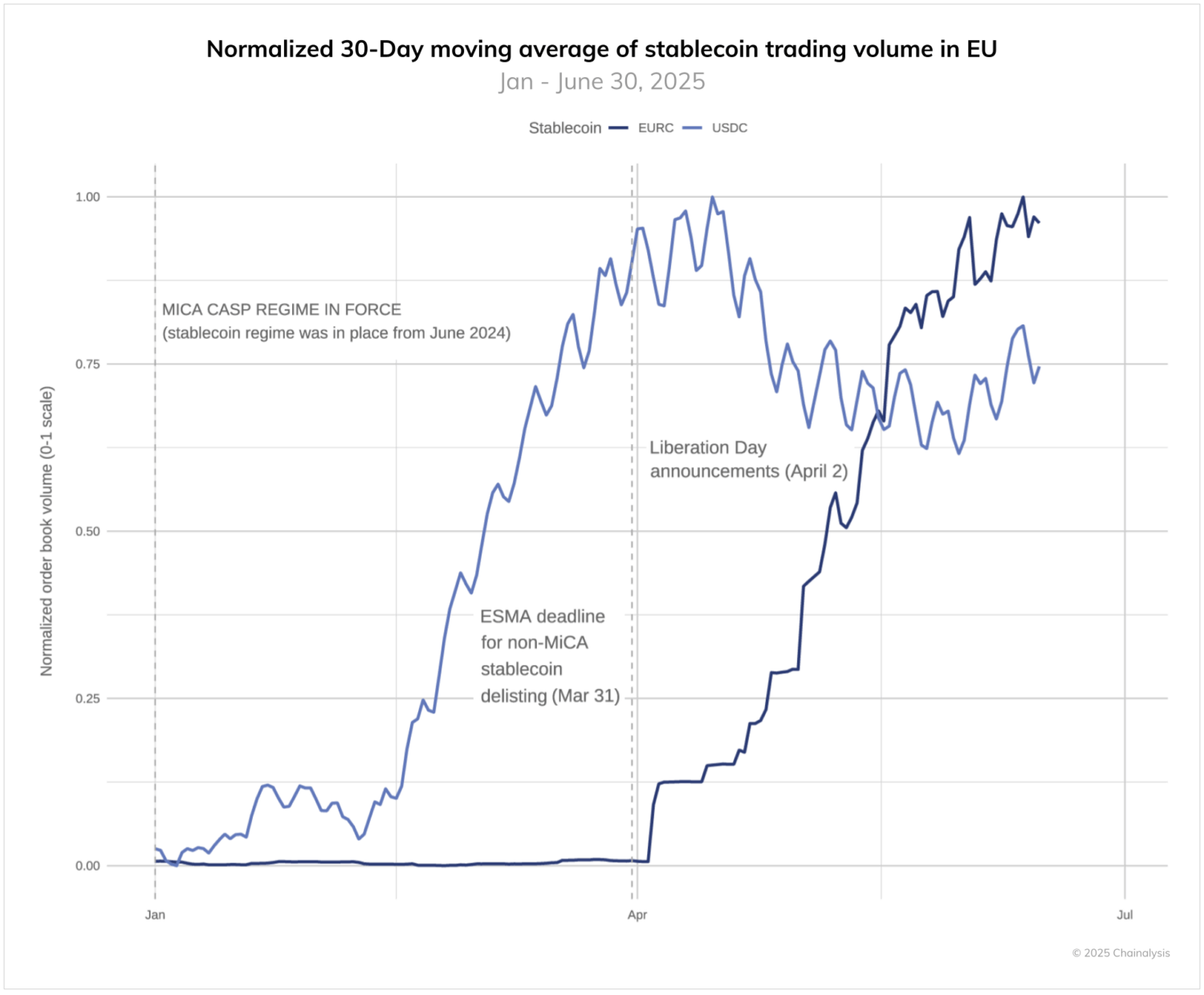 March 2025 (ESMA deadline): USDC volumes stabilized, indicating completion of compliance-driven restructuring.