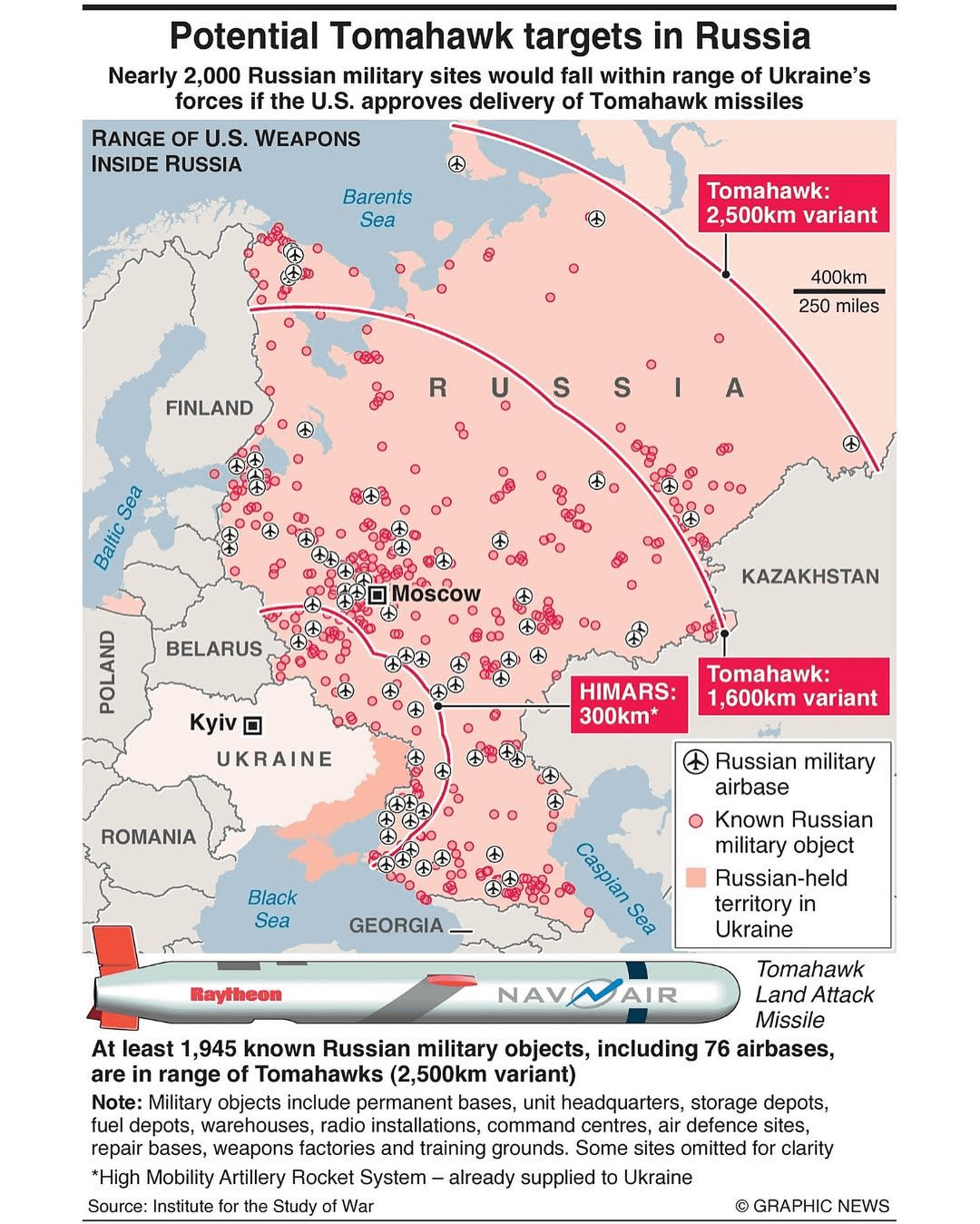 If the U.S. sends Tomahawk cruise missiles to Ukraine, nearly 2,000 Russian military sites — including 76 airbases — could fall within range.