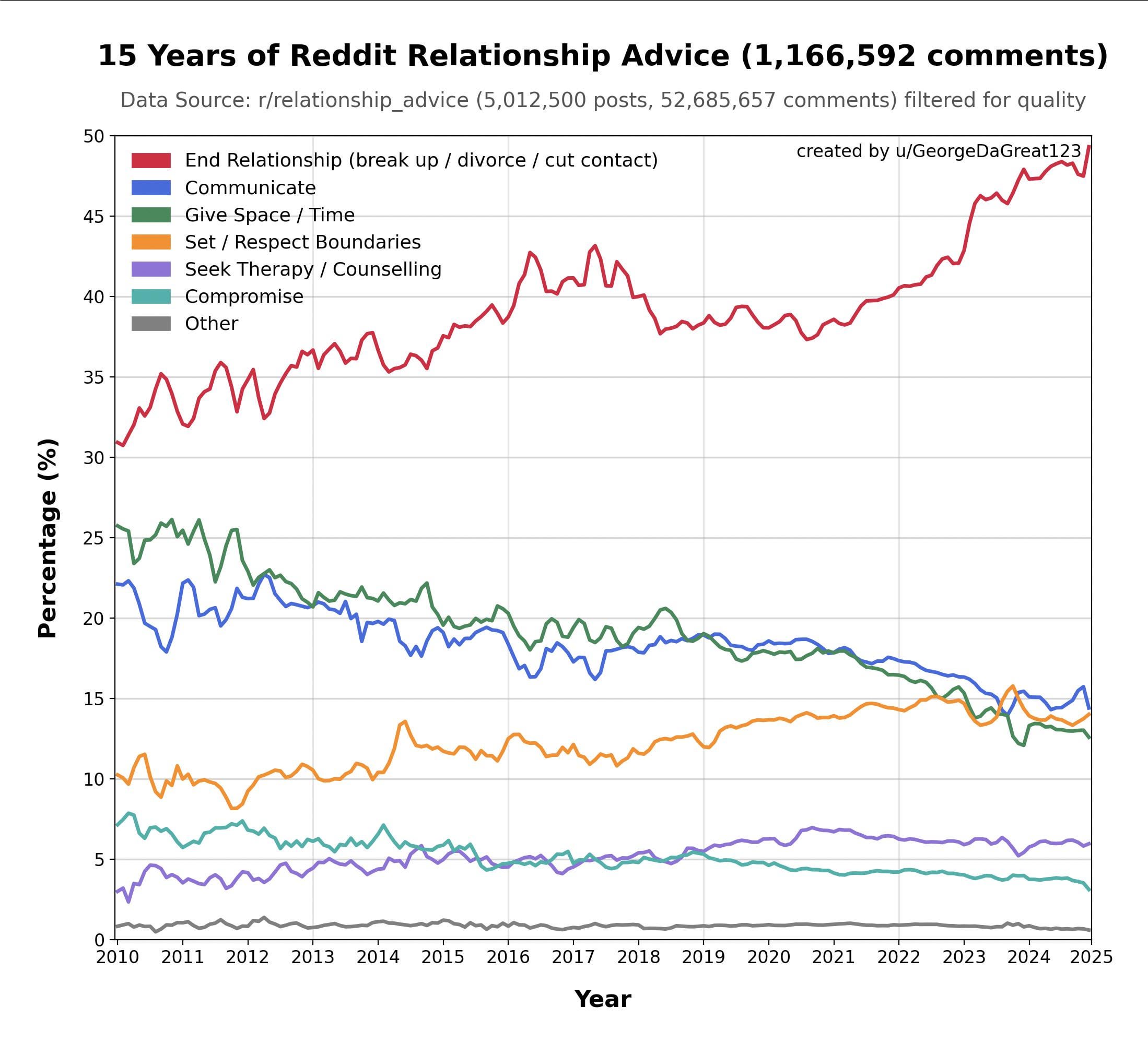 This doesn’t take into account that the last few years of posts are increasingly more Ai written and are more akin to novellas than real life. The reason why breakup/divorce increases is because in those melodramas, that is the real solution lol