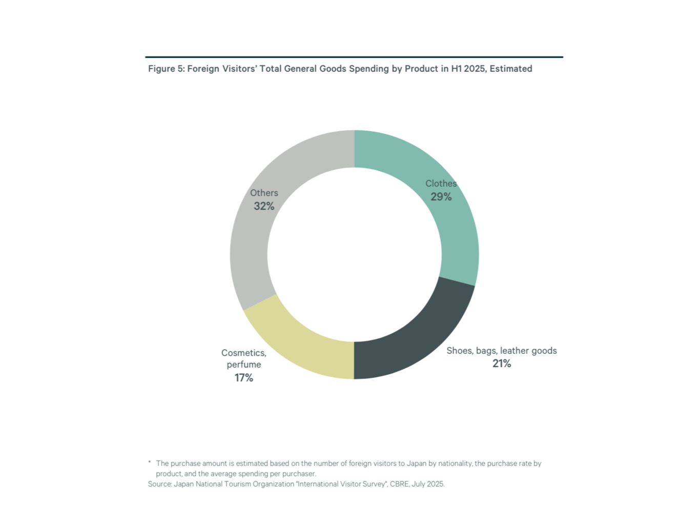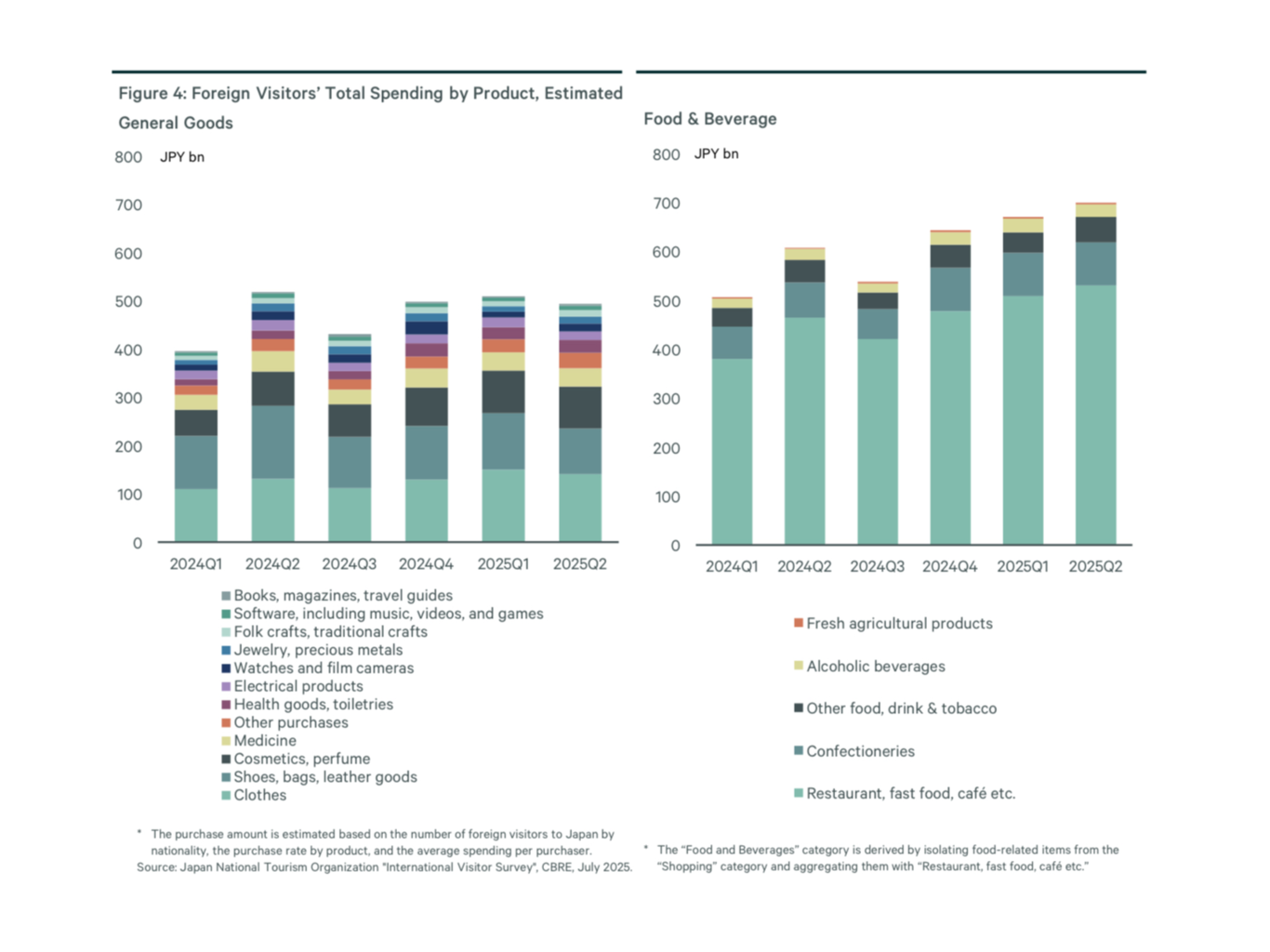 Inbound tourist consumption is transitioning to the “everyday items” and “experiences” categories. In Q2 2025, consumption by foreign visitors fell from the previous year for “shoes, bags, leather goods”, but rose y-o-y for “clothes”, “cosmetics and perfume”, and “food and beverages”.