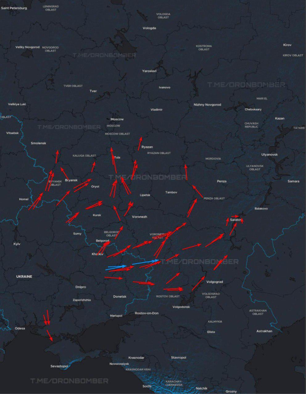Ukrainian long-range strike drones and jet drones (blue arrows) are attacking Russian oil refineries/energy infrastructure/military facilities. Information is current as of 00:00