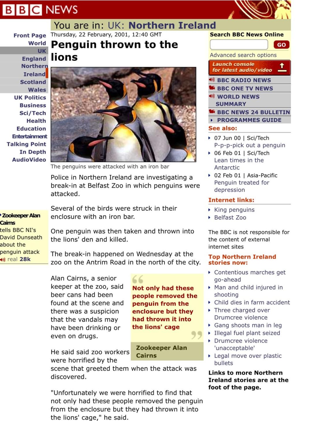 Penguins beaten in paramilitary styled attack wtaf by throwawaydramadisc Tags:Northern IrelandUnited Kingdom 1 comment Love how Belfast zoo is so shit the only thing of note on the Wikipedia for it is a crime Comments are closed.
