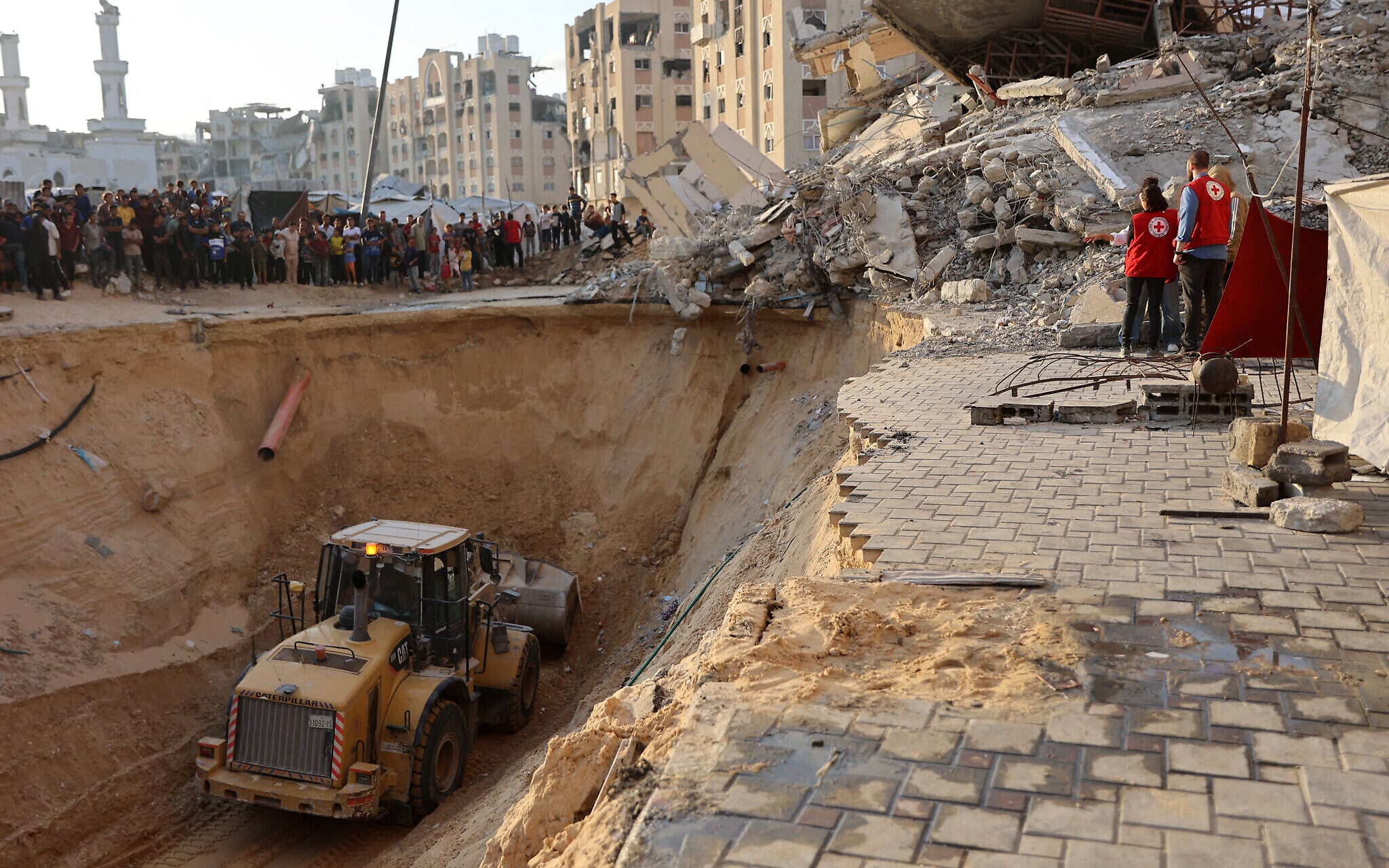 People and members of the International Committee of the Red Cross (ICRC) watch as Palestinians use an excavator to dig deep into the ground, reportedly searching for bodies of hostages, in Khan Younis in the southern Gaza Strip on October 17, 2025 (Omar AL-QATTAA / AFP)