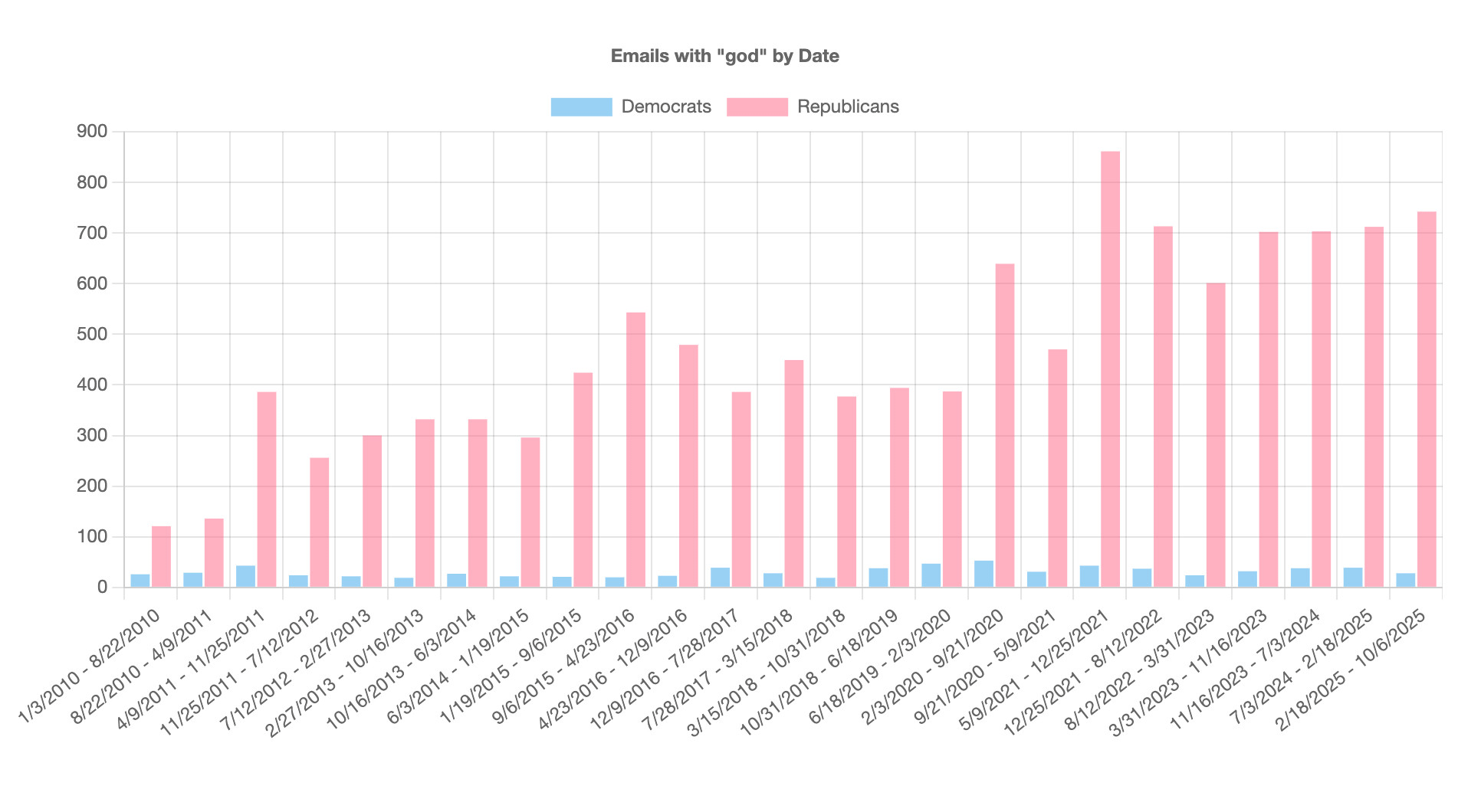 Quite interesting. I think occurrences of “God” / total words, would be a bit more informative to control for the changing number of congressmen from each party, different email frequency leading up to elections, and different email lengths between parties.