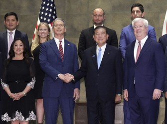 Photo shows Japanese Prime Minister Shigeru Ishiba, center right, and U.S. Treasury Secretary Scott Bessent, center left, who visited Japan to attend the World Exposition in Osaka, shaking hands in Tokyo on July 18, 2025. (Kyodo)