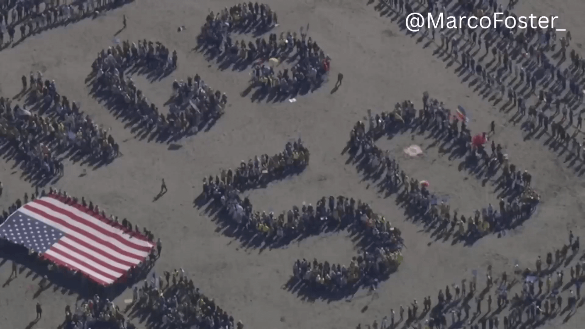 Protesters created a HUGE human sign on San Francisco’s Ocean Beach reading “No Kings YES on 50” to support California’s Prop 50 and stand up against Donald Trump’s fascist regime