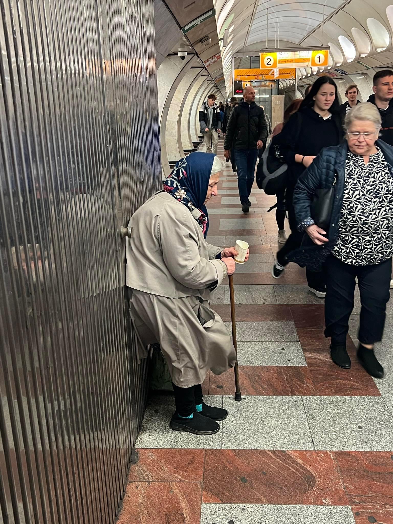 Já nejvíc potkávám pána, někdy je na I.P. Pavlova, někdy na Národní Třídě, chodí z metra do metra a žebrá o peníze. Chodí s holí a má záhadný třes v noze, který existuje jen když žebrá.