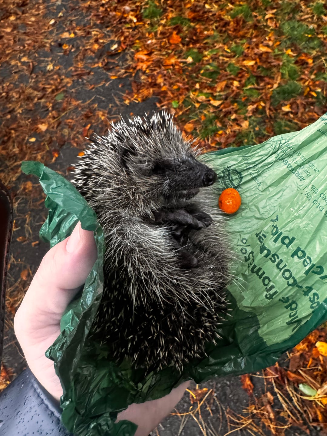 I just noticed a hedgehog crossing the road as I was driving along. Poor wee thing appears to be either unwell or old and frail. Not sure what to do and didn’t want him/her to get squashed so it’s now at home in a shoe box with some cat food and towels.