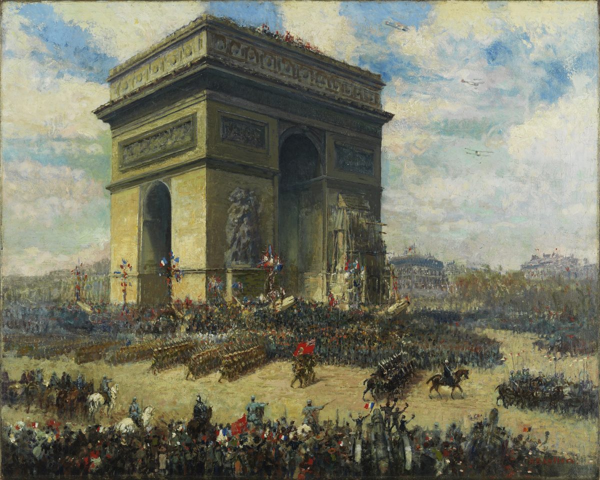 Alfred Bastien’s “Canadians Passing in Front of the Arc de Triomphe” (c. 1919), a painting of Canadian troops on parade under the Red Ensign at Paris’s Arc de Triomphe, part of an Allied victory parade on July 14, 1919 (image public domain via the Canadian War Museum, Toronto, Canada)