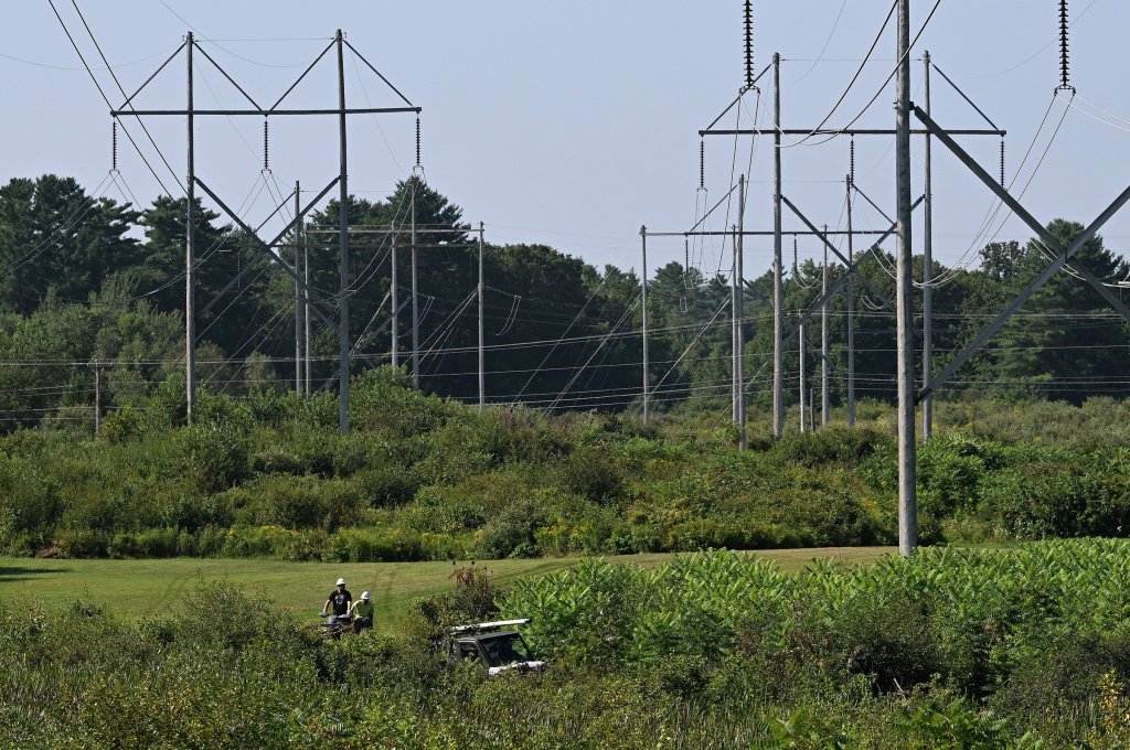 Central Maine Power workers make their way along a trail under transmission lines Aug. 13. (Shawn Patrick Ouellette/Staff Photographer)