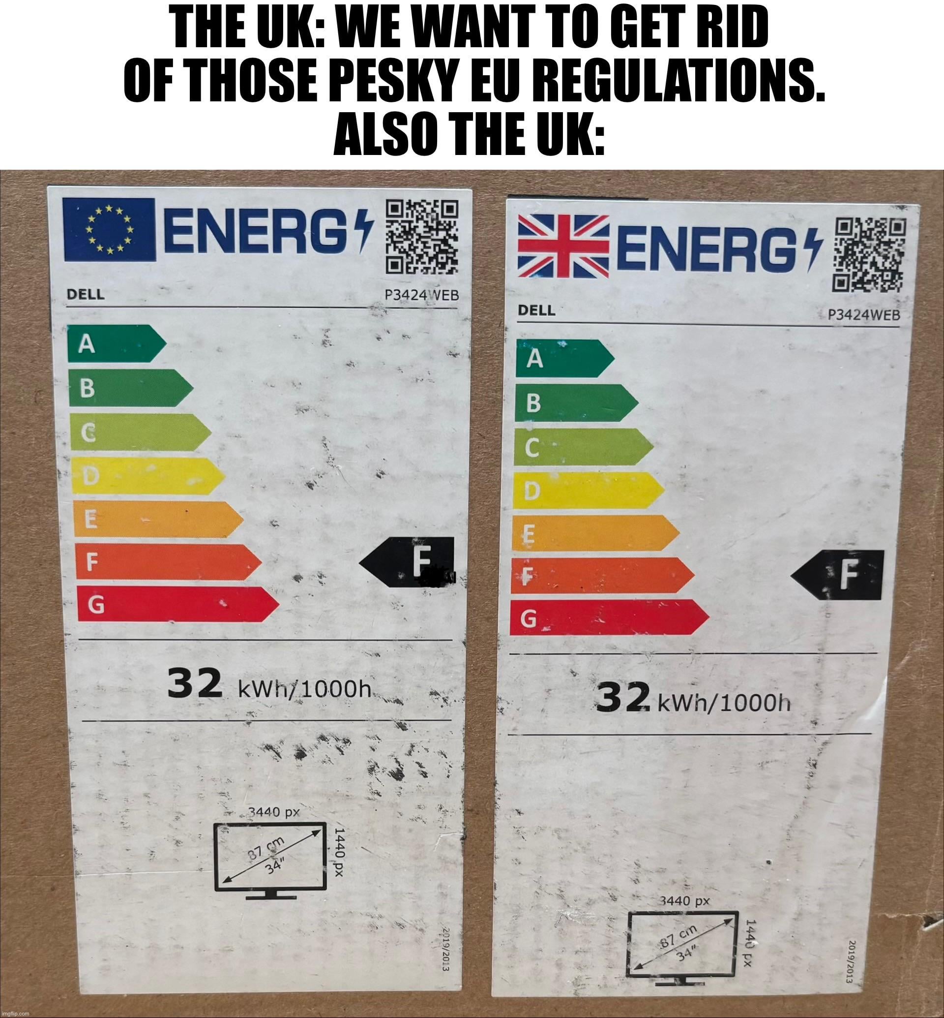 Unironically some British regs pre Europe wide imo made more sense, fire extinguisher colouring or electrical cables colouring for example, but even if our system was better the universality of having Europe wide regs is a benefit you can’t get rid of