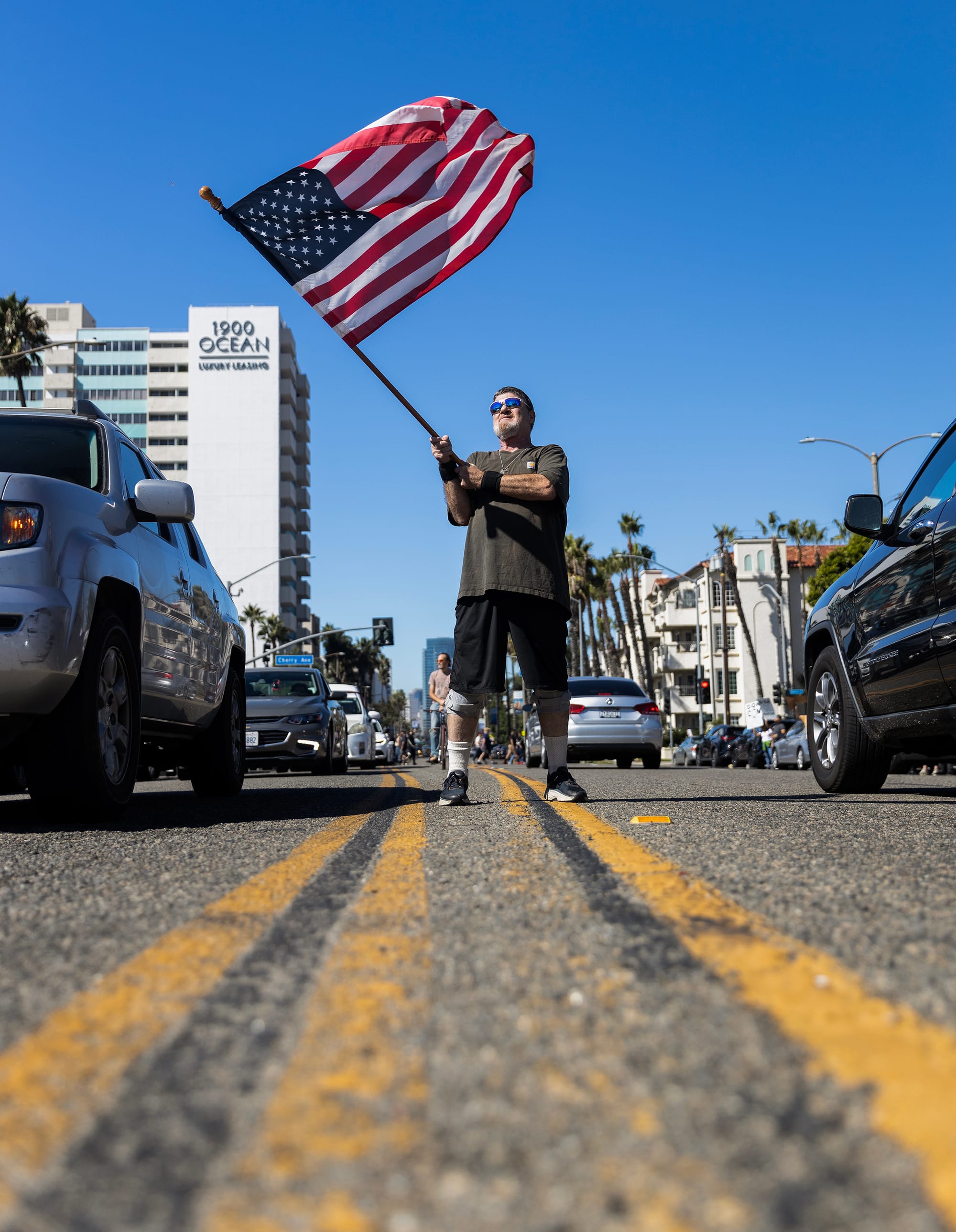 Marine Corps veteran Wayne Theis, 64, a Long Beach resident, waves an American flag in the middle of Ocean Boulevard during the No Kings protest in Long Beach Saturday, Oct. 18, 2025. Photo by Brandon Richardson.