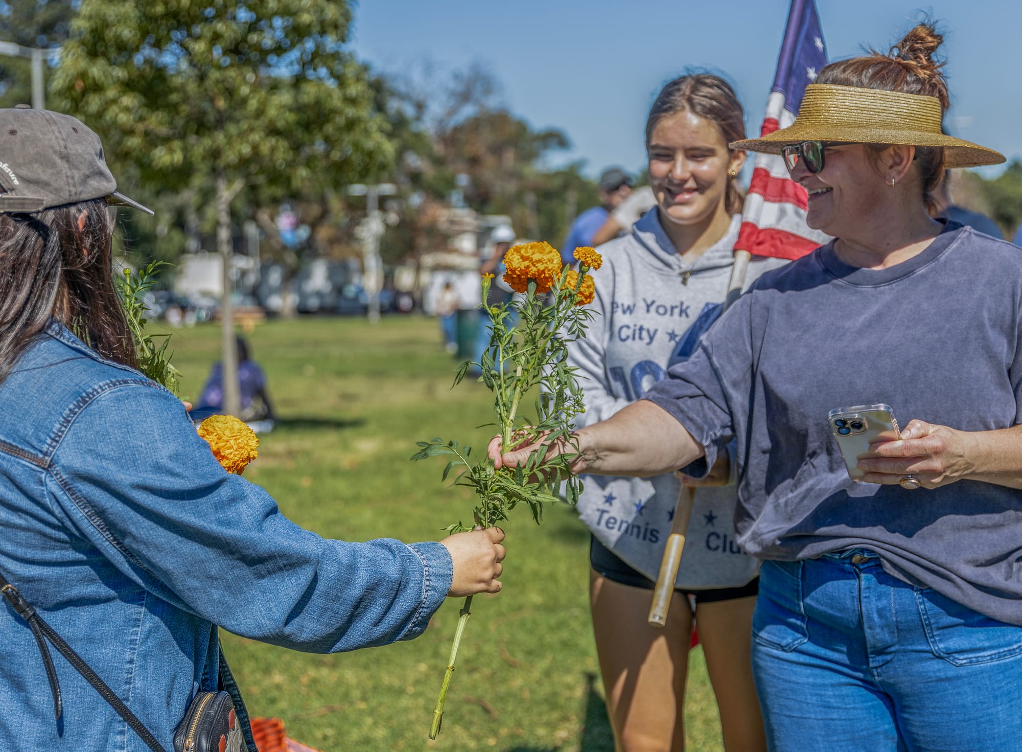 One protester accepts a flower from another, both of whom declined to give their names, during the No Kings protest at Bixby Park in Long Beach Saturday, Oct. 18, 2025. Photo by Brandon Richardson.