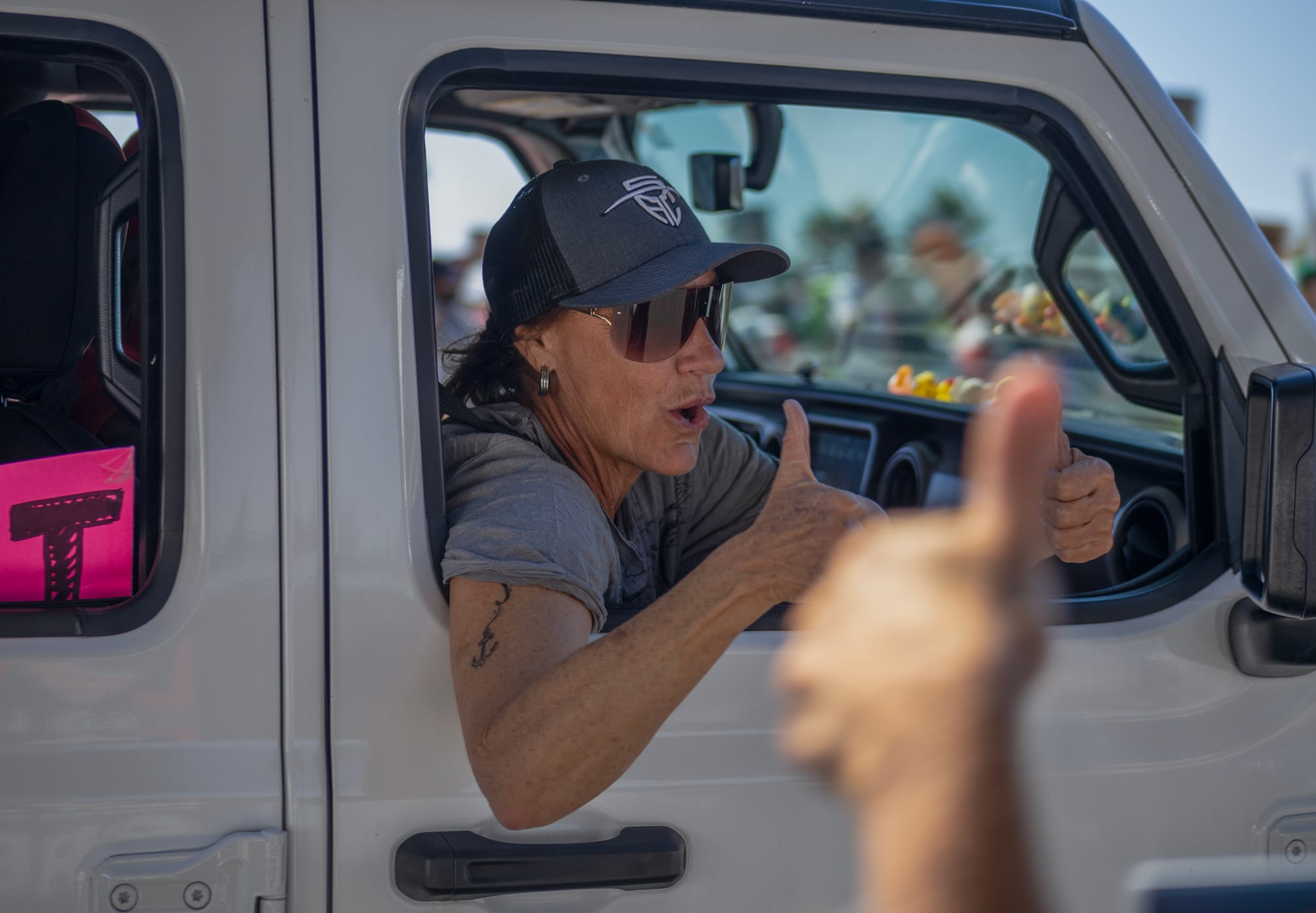 A woman gives protesters thumbs up as she drives by during the No Kings protest in Long Beach Saturday, Oct. 18, 2025. Photo by Brandon Richardson.