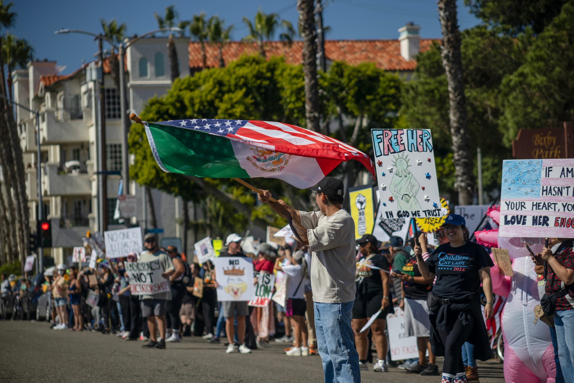 A protester waves American and Mexican flags during the No Kings protest in Long Beach Saturday, Oct. 18, 2025. Photo by Brandon Richardson.