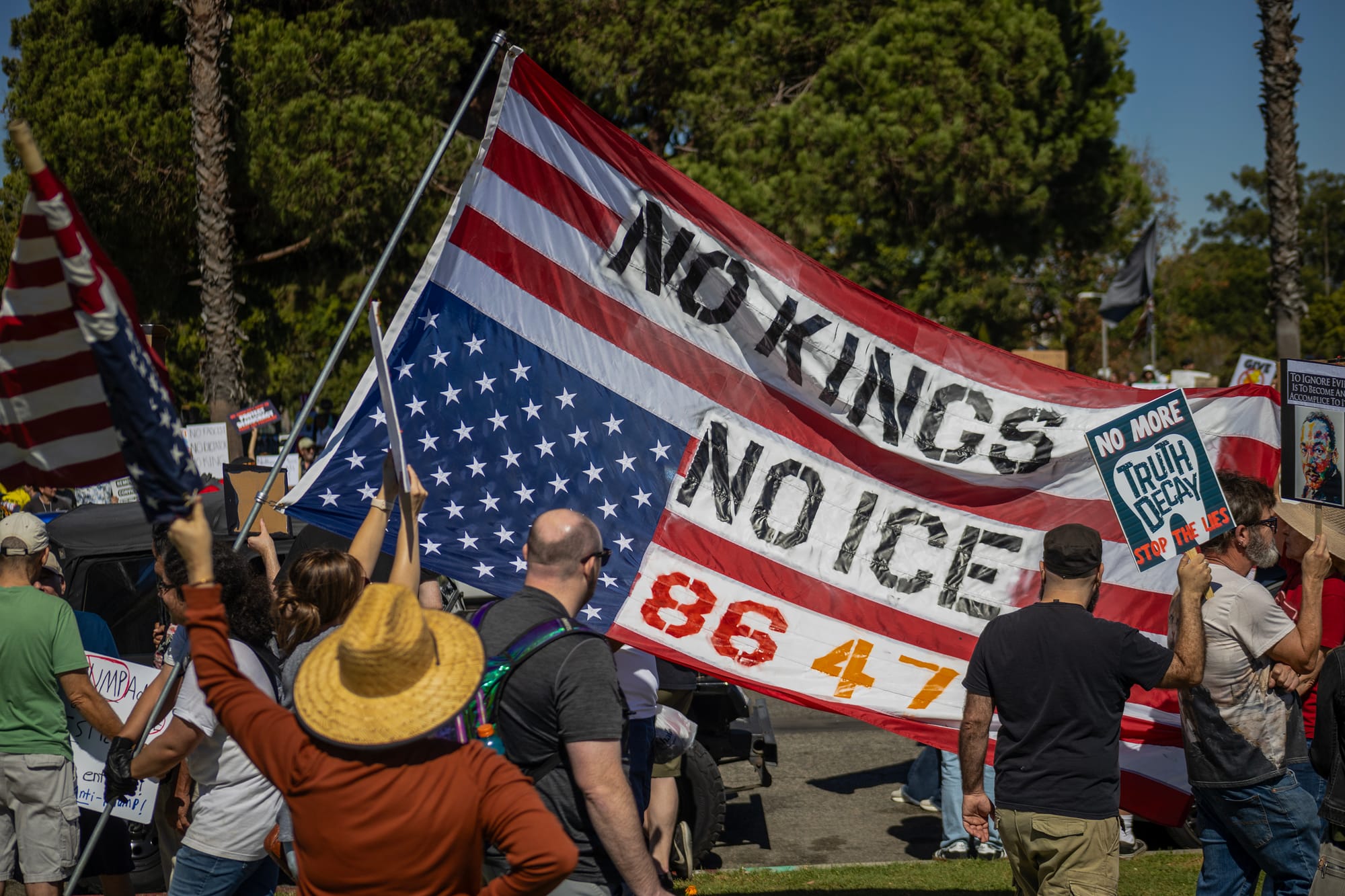 Protesters carry a large inverted American flag, a sign of distress, with the text “no kings,” “no ICE” and “86 47” during the No Kings protest in Long Beach Saturday, Oct. 18, 2025. Photo by Brandon Richardson.