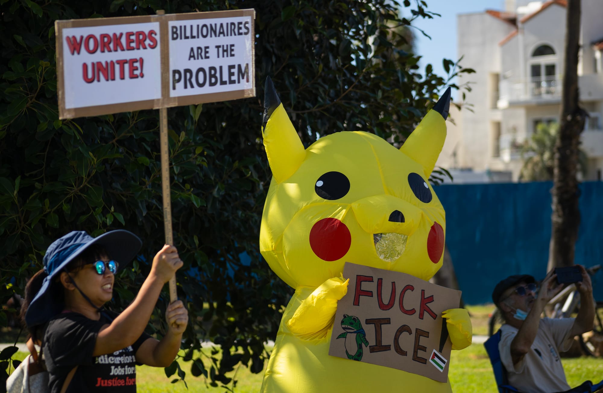 A person dressed in an inflatable Pikachu costume holds a “fuck ICE” sign during the No Kings protest in Long Beach Saturday, Oct. 18, 2025. Photo by Brandon Richardson.