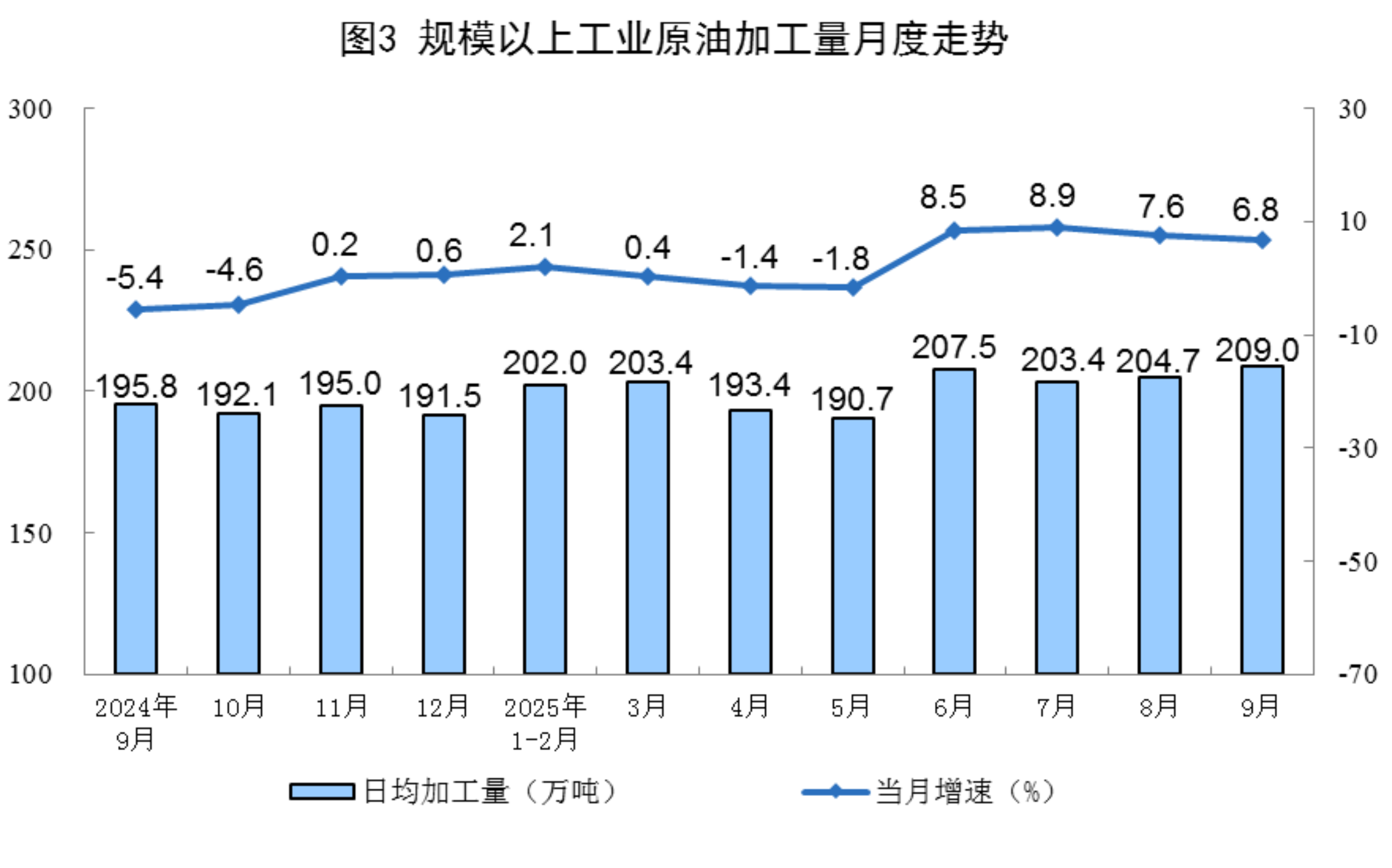 Crude oil processing grew rapidly. In September, the volume of crude oil processed by above-scale industries reached 62.69 million mt, up 6.8% YoY; the daily average processing volume was 2.09 million mt.