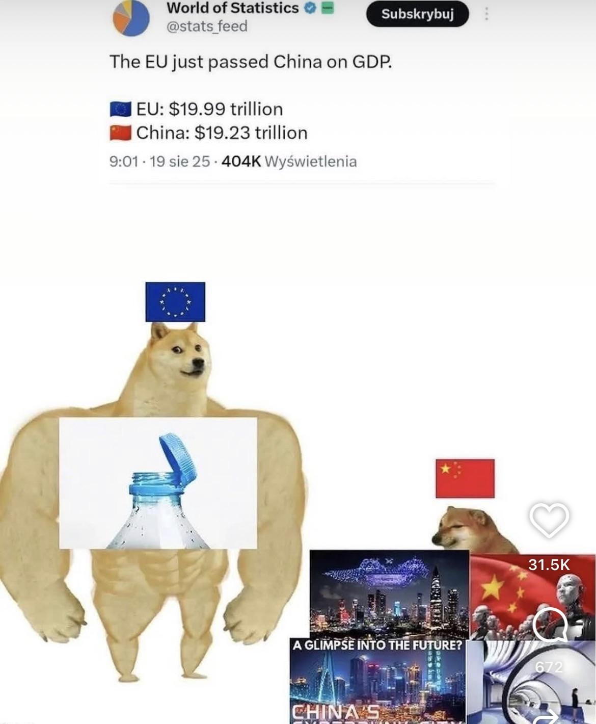Fun fact: this is older data from April. It was recently revised so the European Union is predicted to have a GDP of 21.1 billion dollars in 2025, while China is predicted to have a GDP of 19,4 billion. Europe can’t stop winning 😎🇪🇺
