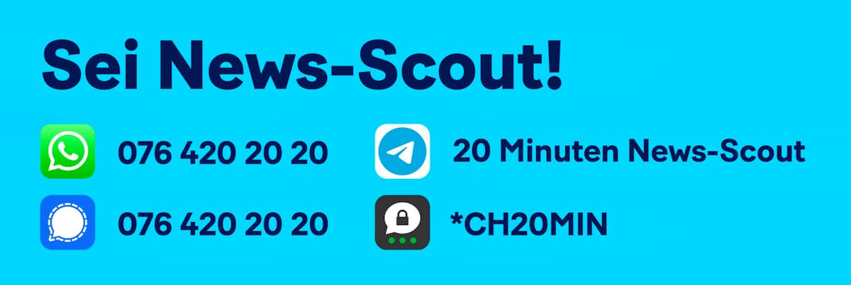 Speichere unseren Kontakt im Messenger deiner Wahl und sende spannende Videos, Fotos und Dokumente direkt an die 20-Minuten-Redaktion. Sendest du uns Fotos oder Videos, die zu einem neuen Beitrag führen, erhältst du eines von vier Geschenken. Mehr Details findest du hier.