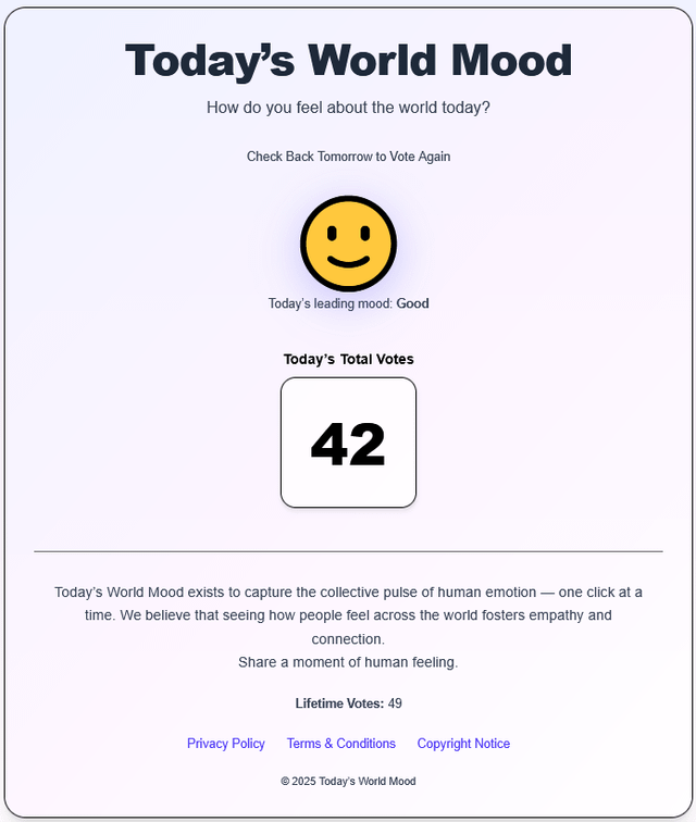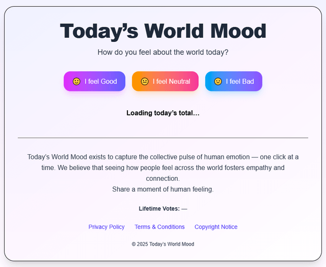 So I built a little project called Today’s World Mood. Everyone gets one vote per day — Good, Bad, or Neutral — and the site updates in real time to show the planet’s overall mood. Unfortunately the data is limited for right now as this is just being deployed.