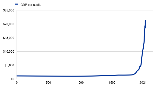 The economic historian Joel Mokyr has studied the question of how growth came about and took hold through the lens of the Industrial Revolution,[1] arguably one of the most interesting economic episodes in human history. For millennia, standards of living remained consistently flat. Economic growth was limited and temporary (i.e. it was not “sustained”). However, at some point in the late 18th and early 19th centuries, the world entered a phase of sustained growth and rising living standards (see Chart 1).[2] It was obvious that the striking growth in income ushered in by this event was spurred by dramatic technology-driven improvements to labour productivity. And yet, back when Mokyr was embarking on his academic career, it was far from clear why the Industrial Revolution happened when it did. Even more puzzling was why it happened in Europe and not in China or India, each of which accounted for a larger share of global GDP in the mid-18th century.