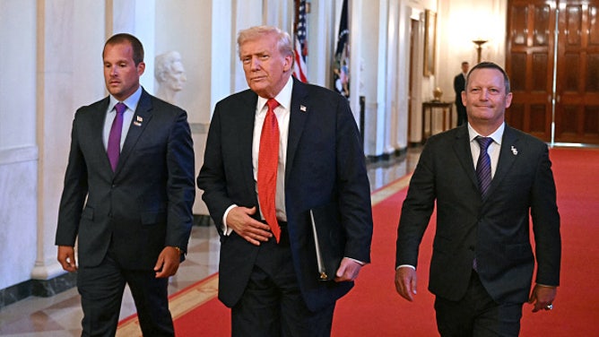 US President Donald Trump arrives, flanked by LSU Shreveport coach Brad Neffendorf (L) and Louisiana State University (LSU) coach Jay Johnson (R), to greet the college baseball teams of Louisiana State University (LSU) and LSU Shreveport, winners of this year College World Series and the National Championships, respectively, at the White House in Washington, DC, on October 20, 2025. (Photo by SAUL LOEB / AFP) (Photo by SAUL LOEB/AFP via Getty Images)