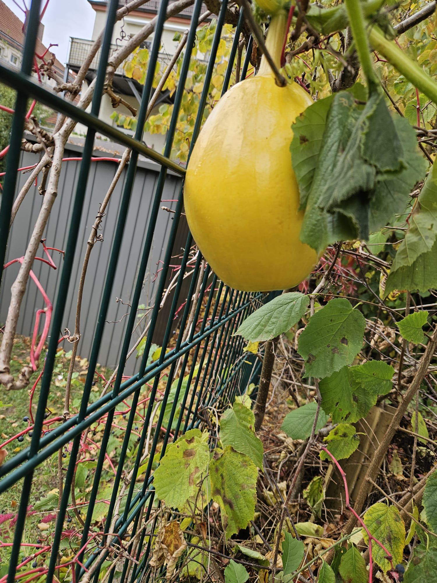 Eigentlich sollte die Frage einfach zu beantworten sein. Das Ding ist an meinem Curcubita pepo (Curcubitaceae) gewachsen. Mich macht es aber stutzig, dass er (noch) gelb ist und so eine "komische" Form im Verhältnis zu einem anderen Kürbis an der selben Pflanze hat. Der andere sieht halt "normal" aus (Orange, eher flach als lang).