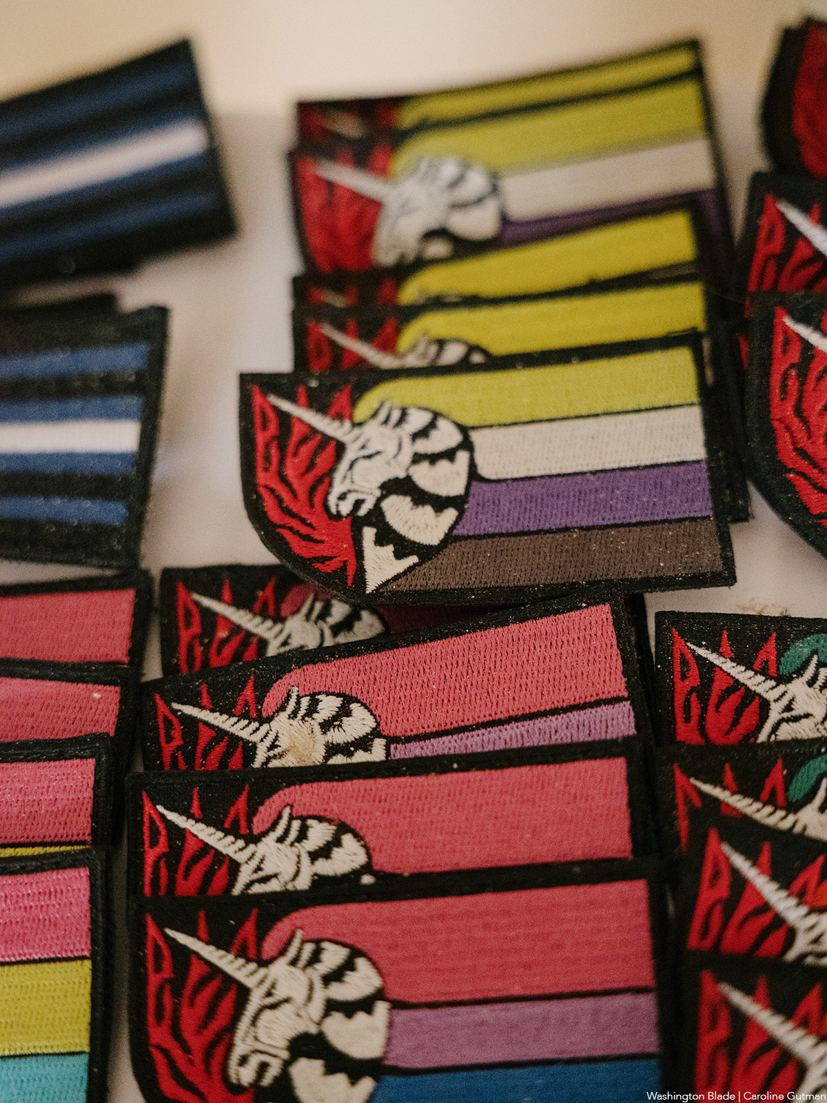 Unicorn Battalion patches at K-41, in Kyiv, Ukraine, on September 9, 2025. (Washington Blade photo by Caroline Gutman)