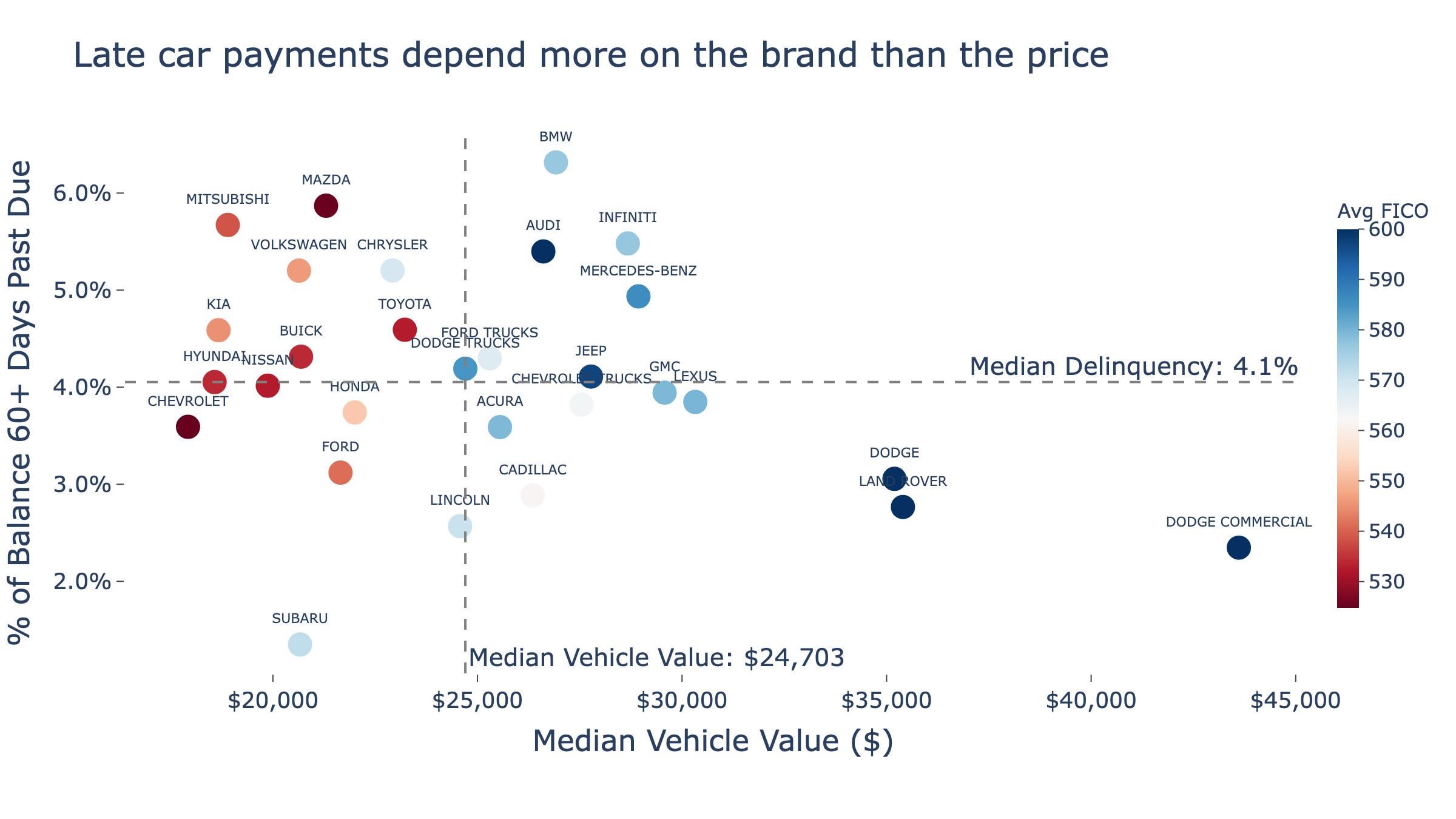 Each point shows the median vehicle value (x-axis) and share of balance 60+ days past due (y-axis). Color = average FICO score at origination.