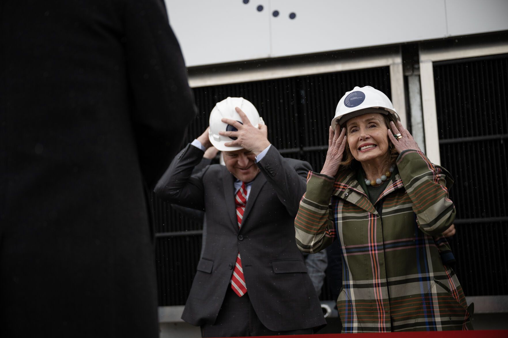 U.S. Rep. Nancy Pelosi, right, and Gov. Jared Polis put on hard hats before a ribbon-cutting in front of the kiloton-scale unit used for removing carbon dioxide from the air Tuesday at Global Thermostat in Brighton.