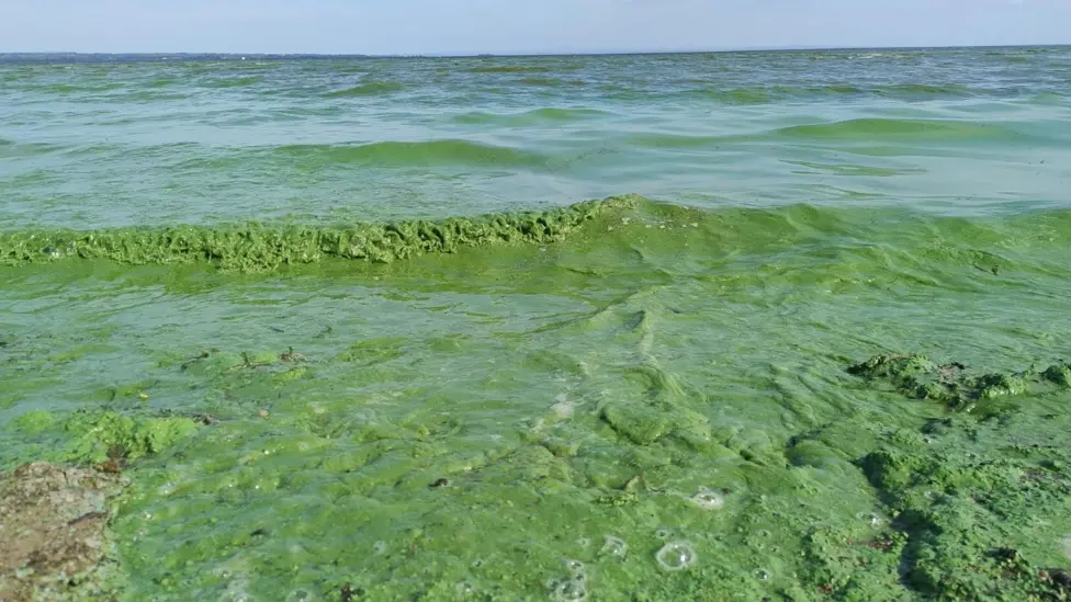 The blue-green algae on Lough Neagh at Battery Harbour in August