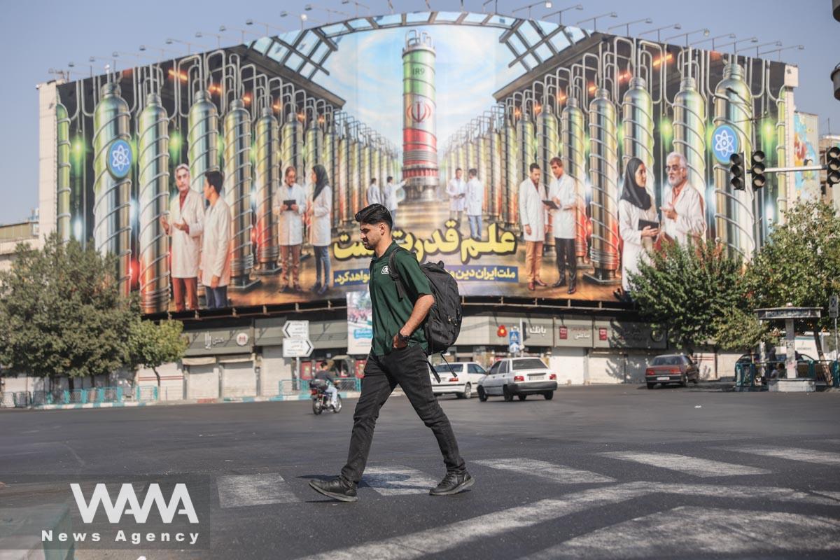 People walk past a billboard with a picture of nuclear scientists killed in Israeli strikes and Iranian centrifuges, on a street in Tehran, Iran August 29, 2025. Majid Asgaripour/WANA (West Asia News Agency)