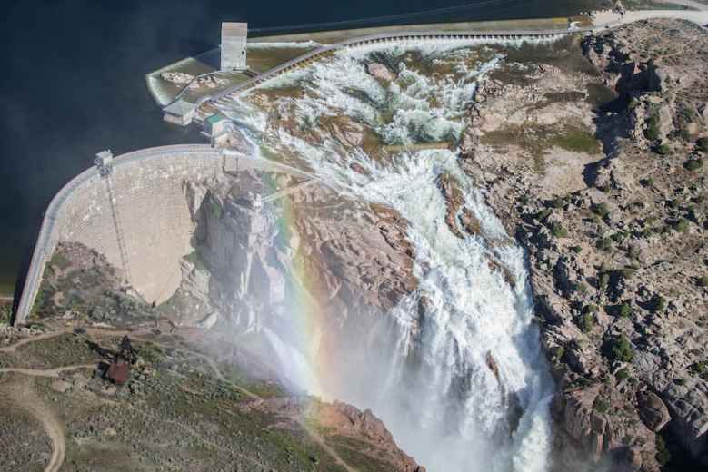 The uncontrolled spillway of the Pathfinder Dam, pictured in June 2016, is an example of water infrastructure administered by the Bureau of Reclamation. (BuRec).