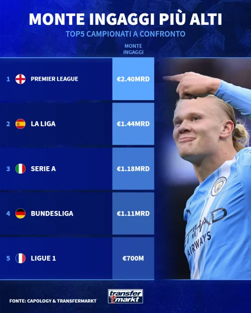 When it comes to leagues, the Premier League has no equal. The 20 English clubs reach a record figure: 2.4 billion euros in salaries. To understand the gap: the English average is 120 million per club, more than Napoli or Roma.