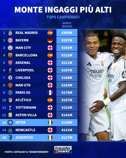 The gap from the elite is evident: between Inter and Atletico Madrid (10th place) there is almost a 20 million difference, and with English clubs like Arsenal or Chelsea, the gap widens even more.