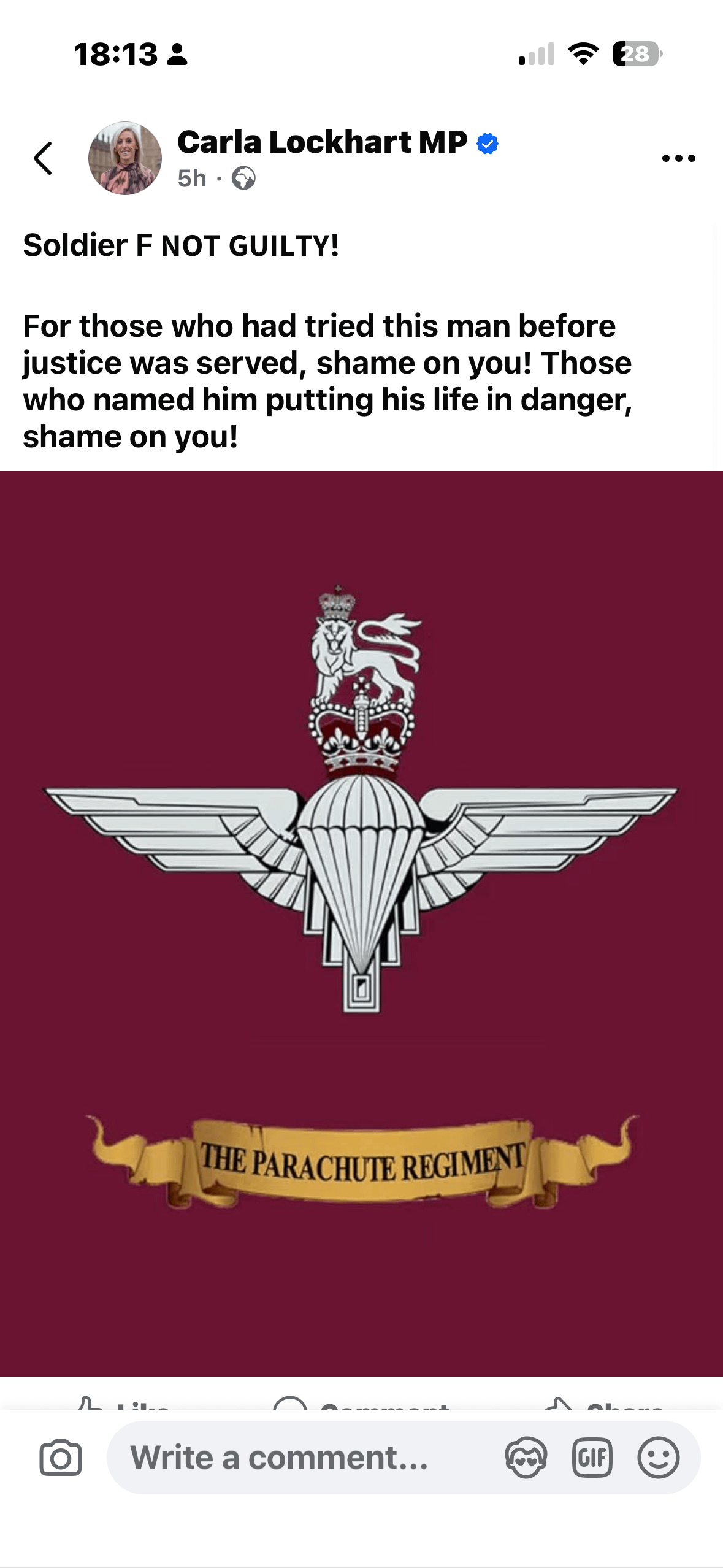 Regardless of whether soldier f did it or not, she has posted the banner of the organisation that carried out the murders. So she has basically posted support for that organisation in specific relation to the events…ridiculous behaviour.