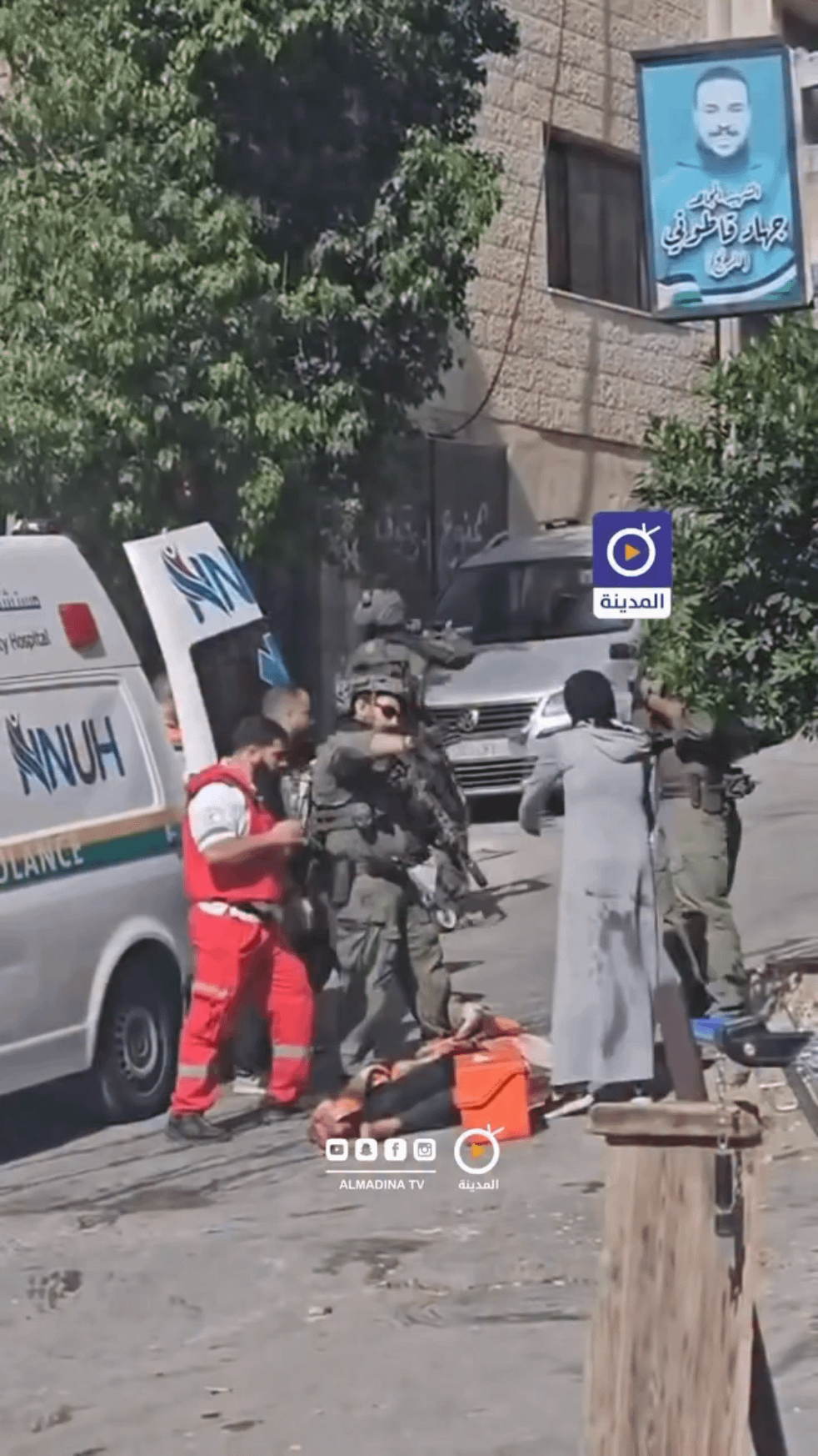 An Israeli soldier assaults a woman as she tries to prevent occupation forces from seizing her husband’s body after he was shot by Israeli troops during their raid on the city of Nablus.