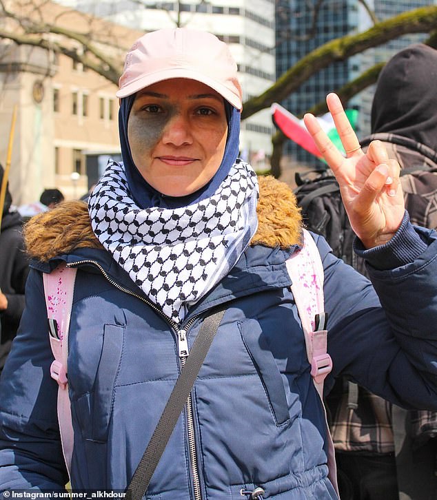 Alkhdour has frequently participated in pro-Palestine protests in Canada (pictured). She was arrested last year and charged with criminally harassing Montreal MP Marc Miller during a demonstration