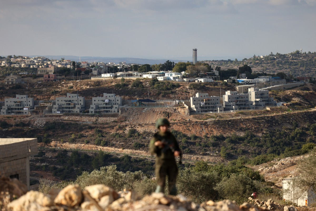 A member of the Israeli security forces stands guard, overlooking the Nahliel settlement (in the background), as security forces block Palestinians reaching their land to harvest olives, in the village of Kobar, near Ramallah, in the Israeli-occupied West Bank on Oct 18, 2025. (PHOTO / AFP)
