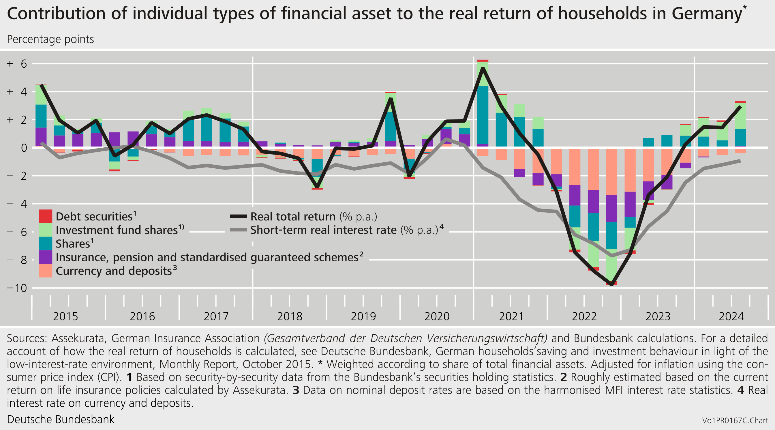 The real total return – i.e. adjusted for inflation – on households’ financial assets represents the actual return on financial assets for households based on the period-specific asset structure of financial assets. It rose to just under 3 % in the third quarter of 2024, with shares and investment fund shares, in particular, contributing positively to the real total return. The real return on cash and deposits remained negative, which continued to have a dampening effect.
