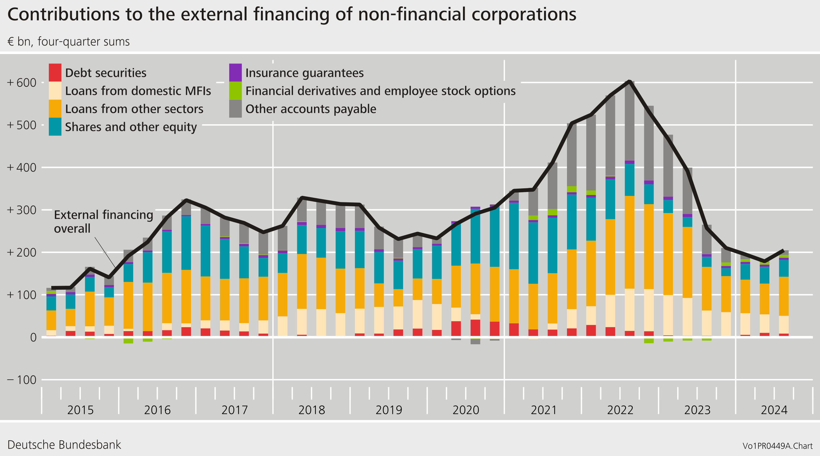 In annual terms, i.e. based on four-quarter moving sums, non-financial corporations’ external financing thus grew for the first time since the third quarter of 2022.