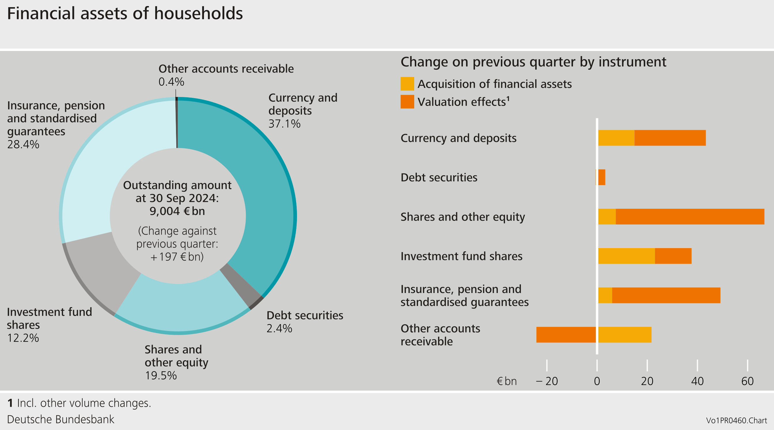 This means that stocks have increased significantly more than in the previous quarter[1], with valuation gains on insurance and pension claims accounting for €43 billion.[2] Investment fund shares generated valuation gains of €15 billion, reflecting positive developments in the investment market despite temporary fluctuations.
