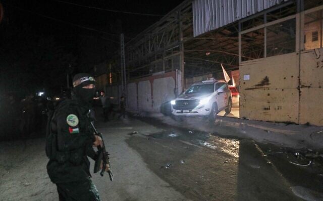 A gunman from the military wing of Hamas stands guard as Red Cross vehicles allegedly transporting coffins containing the bodies of four deceased hostages leave a warehouse for Israel, in Gaza City, October 14, 2025. (AP/Yousef Al Zanoun)