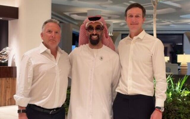 US special envoy Steve Witkoff (L), UAE National Security Adviser Tahnoon Bin Zayed and US President Donald Trump’s adviser and son-in-law Jared Kushner in Abu Dhabi on October 22, 2025. (Tahnoon Bin Zayed Al Nahyan/X)